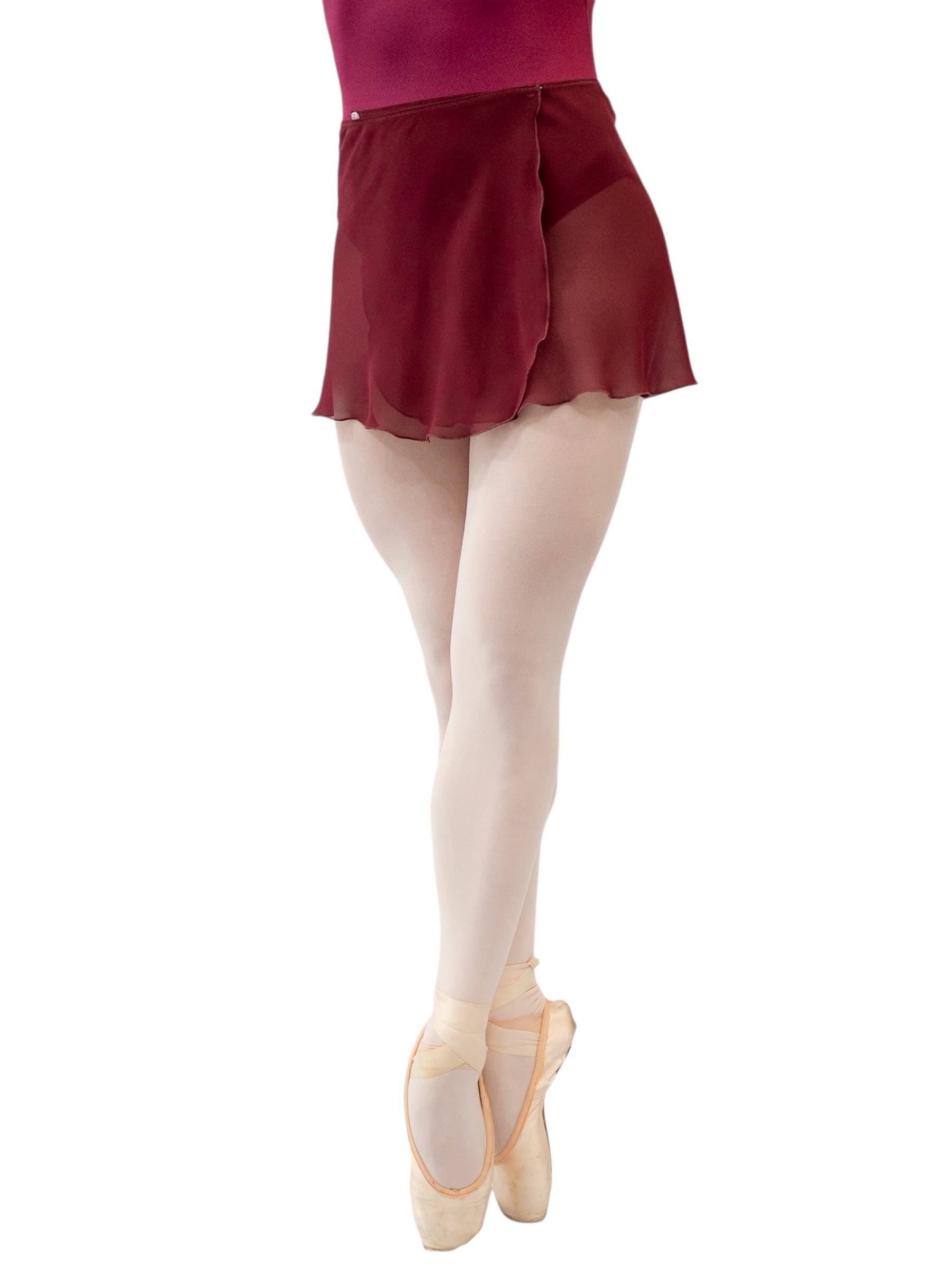 The MP301 burgundy short wrap skirt is perfect for use during your rehearsals or ballet classes. Designed to complement any dancer beautifully, this ballet skirt is made of Georgette, a sheer fabric that drapes elegantly on the body.